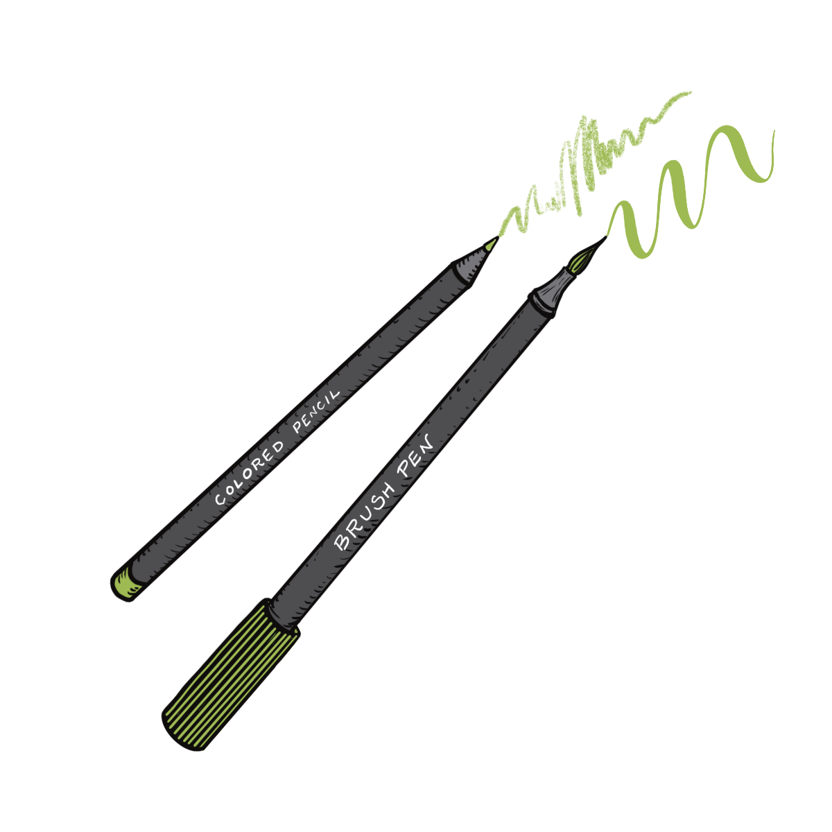 I always finish my illustrated journal drawings with color. I use different mediums depending on my mood and whether I am traveling while creating the drawing. My favorite ways to color my journals are colored pencils, water-based brush pen markers, or sometimes watercolor.