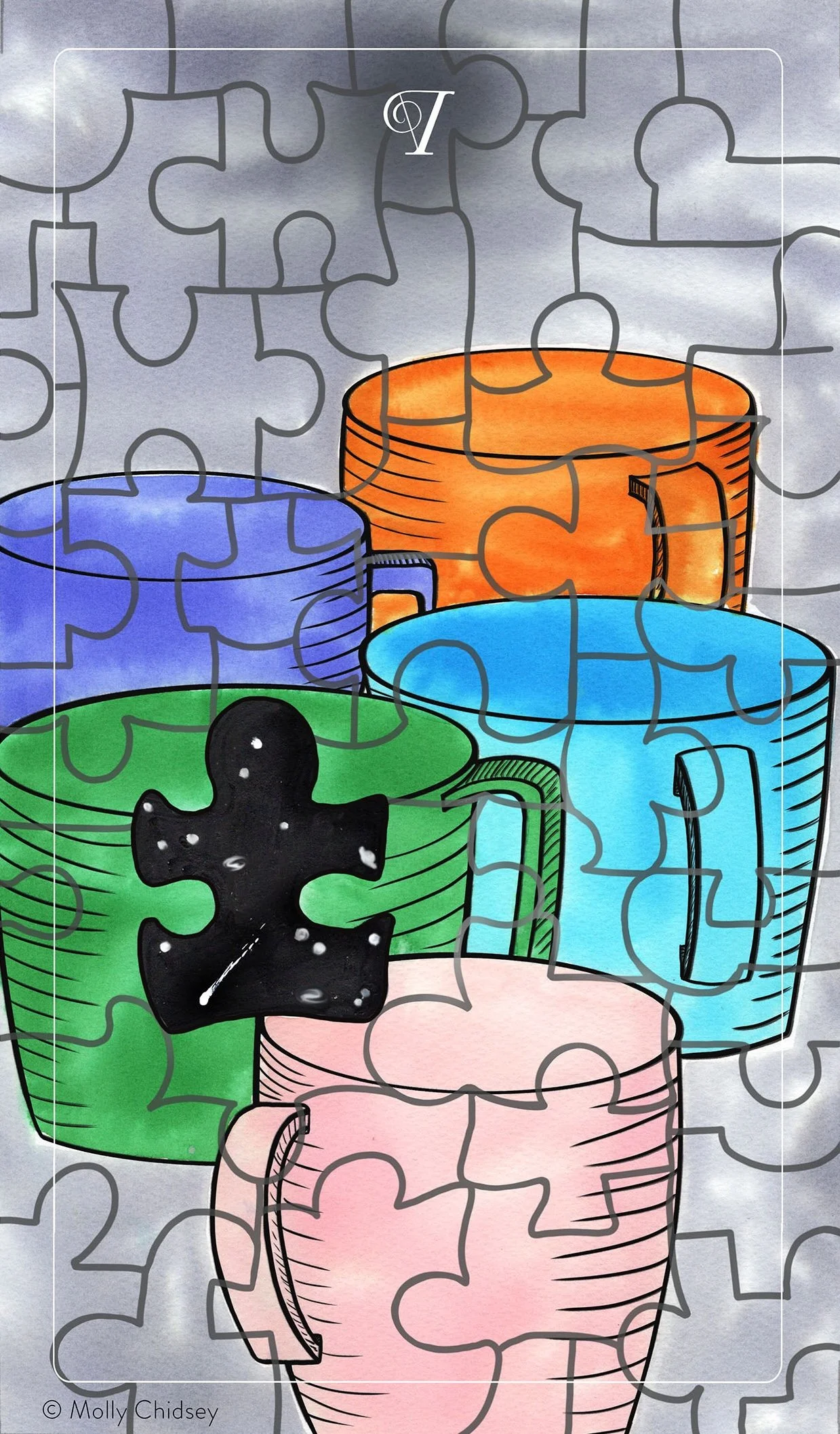When I meditated on the themes of the Five of Cups when creating this illustration, I closed my eyes and thought of my dad. I thought of the role he played in our family, and the profound sense of loss I felt without him. I imagined a puzzle, with one missing piece. That piece you keep looking for, but never appears, and the puzzle remains incomplete.