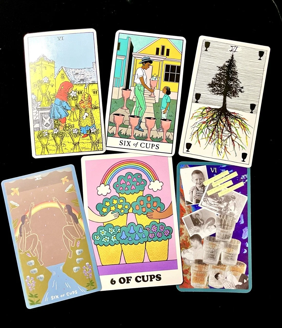 Six of Cups cards from my collection of tarot decks; see footnotes for artist credits.