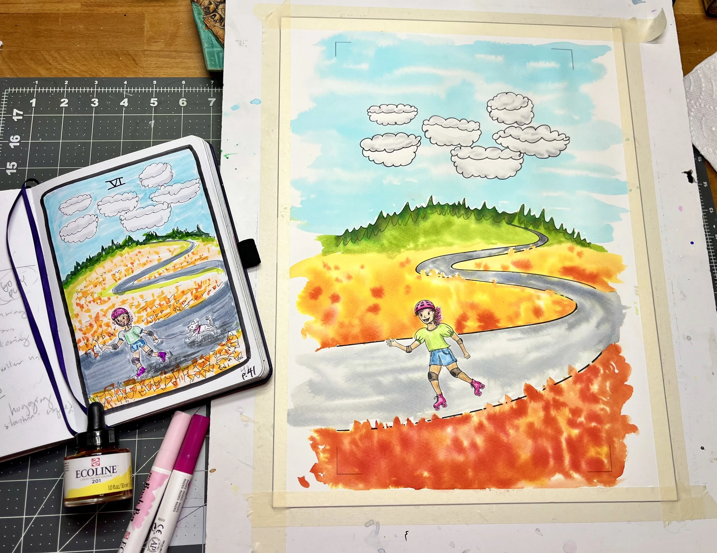 Blick Hot Press 100% cotton watercolor paper; EcoLine liquid watercolor paint and brush pens; Winsor & Newton masking fluid. I use an Epson Workforce Pro printer to print my drawings onto watercolor paper, using their water-resistant Durabrite ink.
