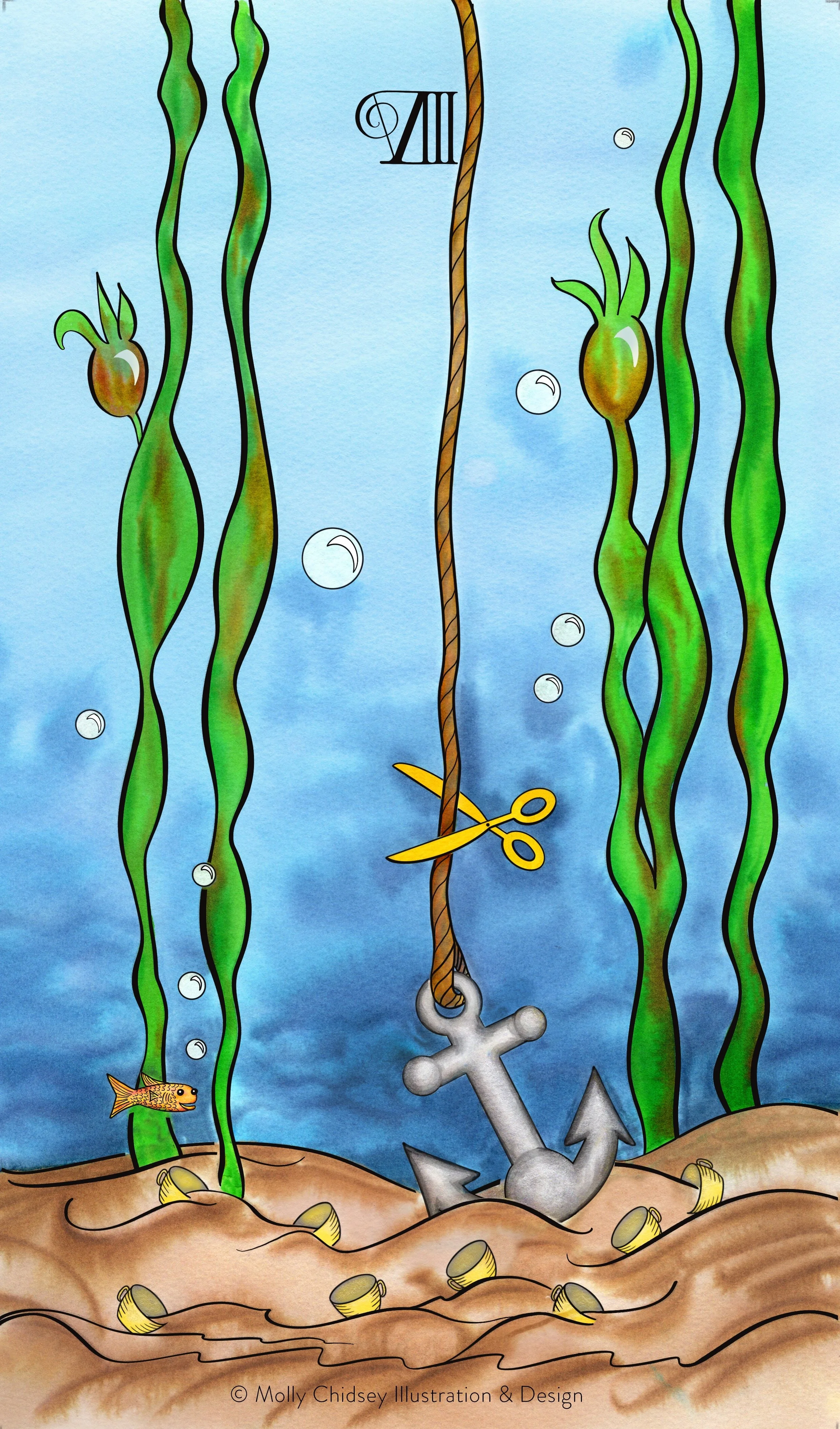 My concept for this card is an anchor under the sea, surrounded by sunken treasure (golden cups). The anchor is tied to a thick rope. A pair of golden scissors cuts the rope.