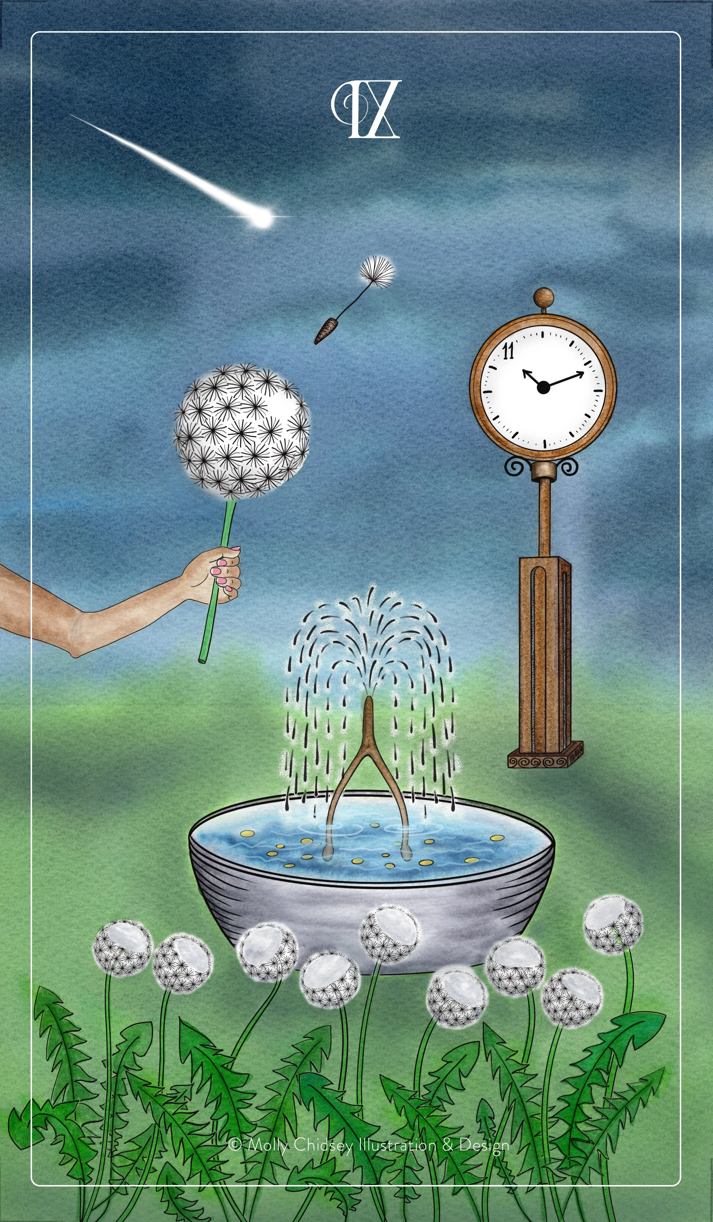 There’s a lot going on in this illustration, so to ensure it would be visible at a small tarot card scale, I wanted to incorporate contrast. The whole scene takes place at dusk, which helps provide a dark contrasting background to the shooting star, clock tower, coin fountain, and dandelion fluffs.